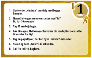 30 action kort med hver 6 spændene og sjove opgaver + 1 børneopgave. Der tildeles forskellige antal point ved at opgaverne bliver løst.