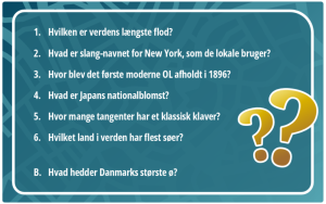 120 almene quizkort (+1 dækkort) med hver 6 almene spørgsmål med hver 3 svarmuligheder hvoraf 1 svar er korrekt + 1 børnespørgsmål med 2 svarmuligheder. Korrekte svar giver 1 point.