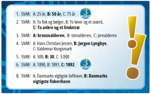 30 special quizkort (+1 dækkort) med hver 6 lokale- og firmaspørgsmål med hver 3 svarmuligheder hvoraf 1 svar er korrekt + 1 børnespørgsmål med 2 svarmuligheder. Korrekte svar giver 2 til 3 point.
